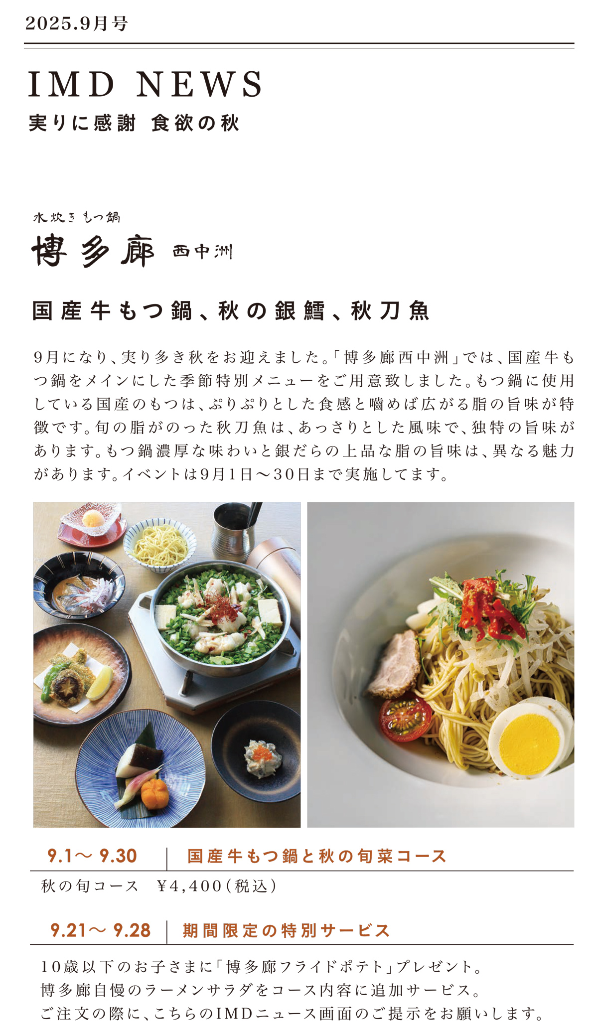 • 国産牛もつ鍋、秋の銀鱈、秋刀魚